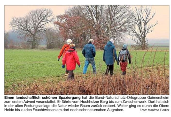 Bericht im Donaukurier am 12.12.25 DK Bericht vom 5.Dezember DK Bericht vom 20.November DK-Bericht vom 26.September "Auf dem Sprunge" in Wettstetten DK Bericht vom 19.September "Clean Up Retzbach" DK Bericht vom 22.Aug. BN Exkursion Eitensheimer Flur DK Bericht vom 22. August DK-Bericht vom 8. Juli DK Bericht vom 19.06.25 über die Exkursion "Orchideen am Reisberg" am 1.Juni. DK 25.4.25 vom Vortrag Naturnaher Garten im Backhaus Gaimersheim am 1.April DK vom 14.3.25 von der Märzenbecherwanderung am 9.März. DK Bericht vom 14.2.25 von der Nistkastenkontrolle am 8.2. DK Bericht vom 17.1.25 BN Exkursion Schuttermoos